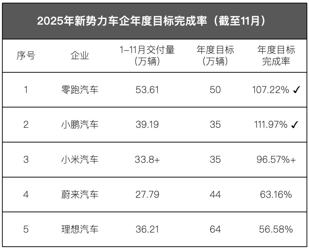 零跑(107.22%)和小鹏(111.97%)“提前交卷”;小米(96.57%+)已经一只脚迈线,完成目标没有悬念;