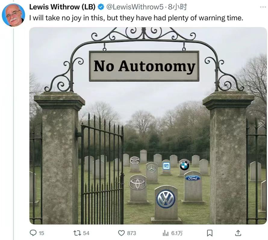 图片里的一众车企巨头被埋葬在一个“无自主权”墓园里,在暗讽“没救了”。