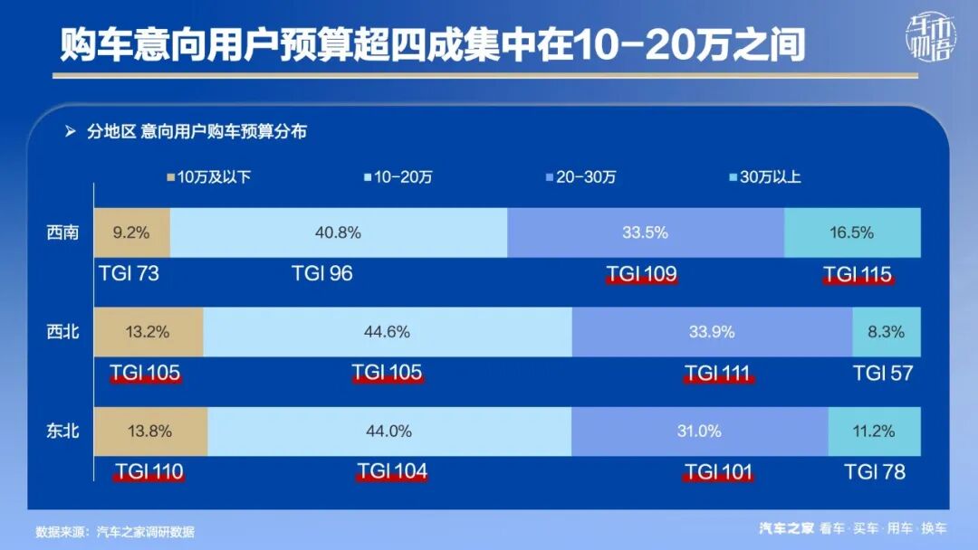 细分市场来看,西南地区的高预算用户占比相对更高,其中30万以上TGI达到115;西北和东北地区均为20万以下预算区间更为突出,其中东北地区预算10万及以下更为显著,TGI为110,三个地区中最高。