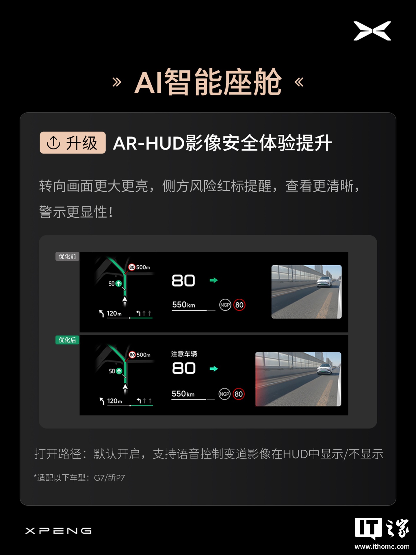 AR-HUD 影像安全体验提升:转向画面更大更亮,侧方风险红标提醒,查看更清晰警示更显性。打开路径:默认开启,支持语音控制变道影像在 HUD 中显示 / 不显示。适配以下车型:G7 / 新 P7。