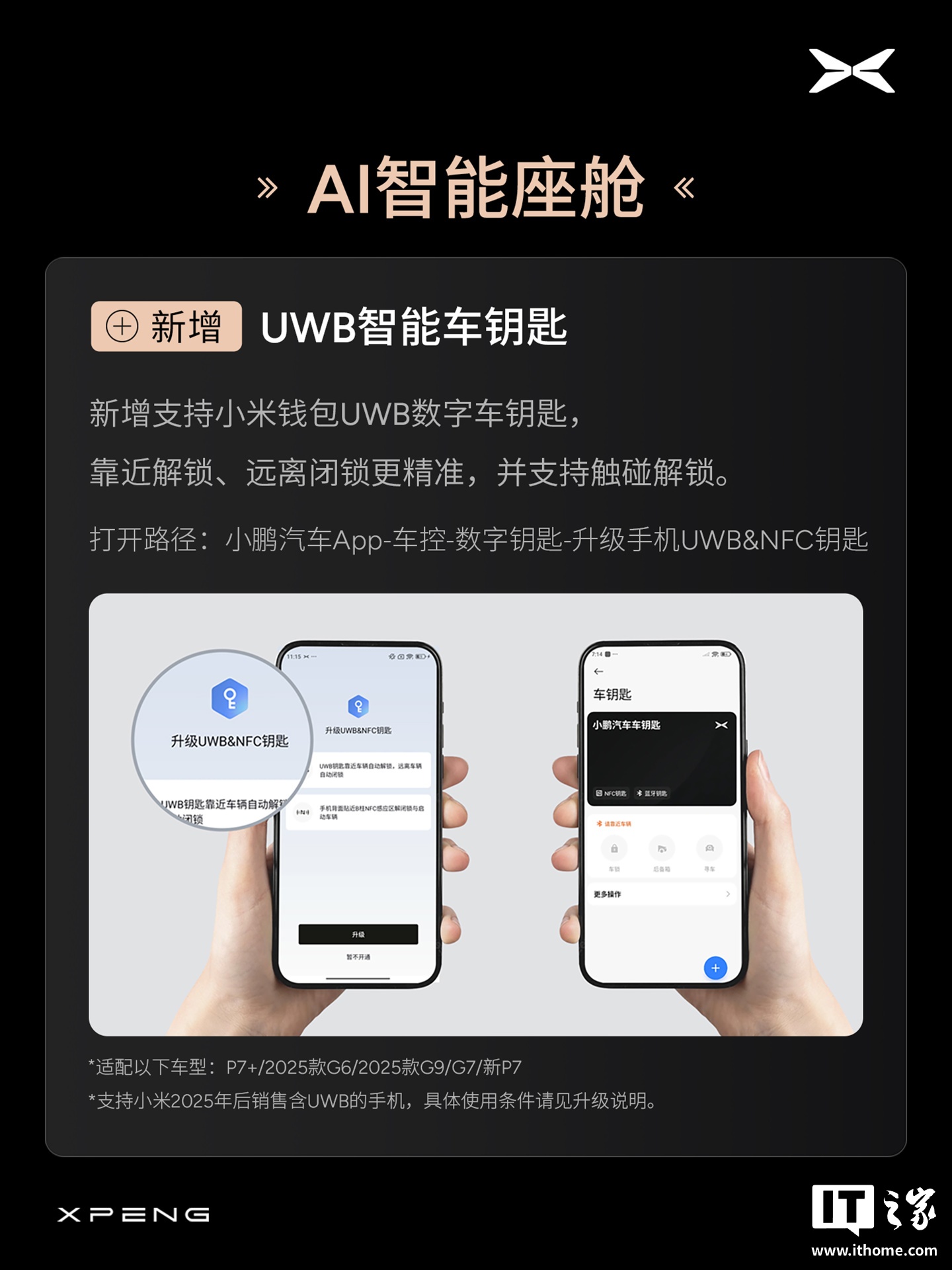 新增 UWB 智能车钥匙:新增支持小米钱包 UWB 数字车钥匙,靠近解锁、远离闭锁更精准,并支持触碰解锁。打开路径:小鹏汽车 App-车控-数字钥匙-升级手机 UWB & NFC 钥匙。适配以下车型:P7+ / 2025 款 G6 / 2025 款 G9 / G7 / 新 P7。支持小米 2025 年后销售含 UWB 的手机,具体使用条件请见升级说明。