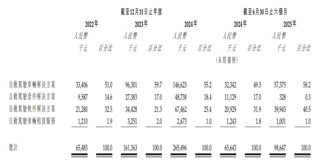 在其四大类产品与服务中,自动驾驶车辆解决方案的营收占比最高,2024年这一比例为55.2%,2025年上半年达58.2%;其次是自动驾驶软件解决方案业务,2024年占总营收的25.4%,2025年上半年占比40.5%。