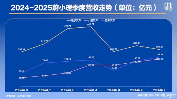 虽然理想汽车的营收跟着销量一起下滑,但273.6亿元的营收依然比蔚来、小鹏高1/4以上。