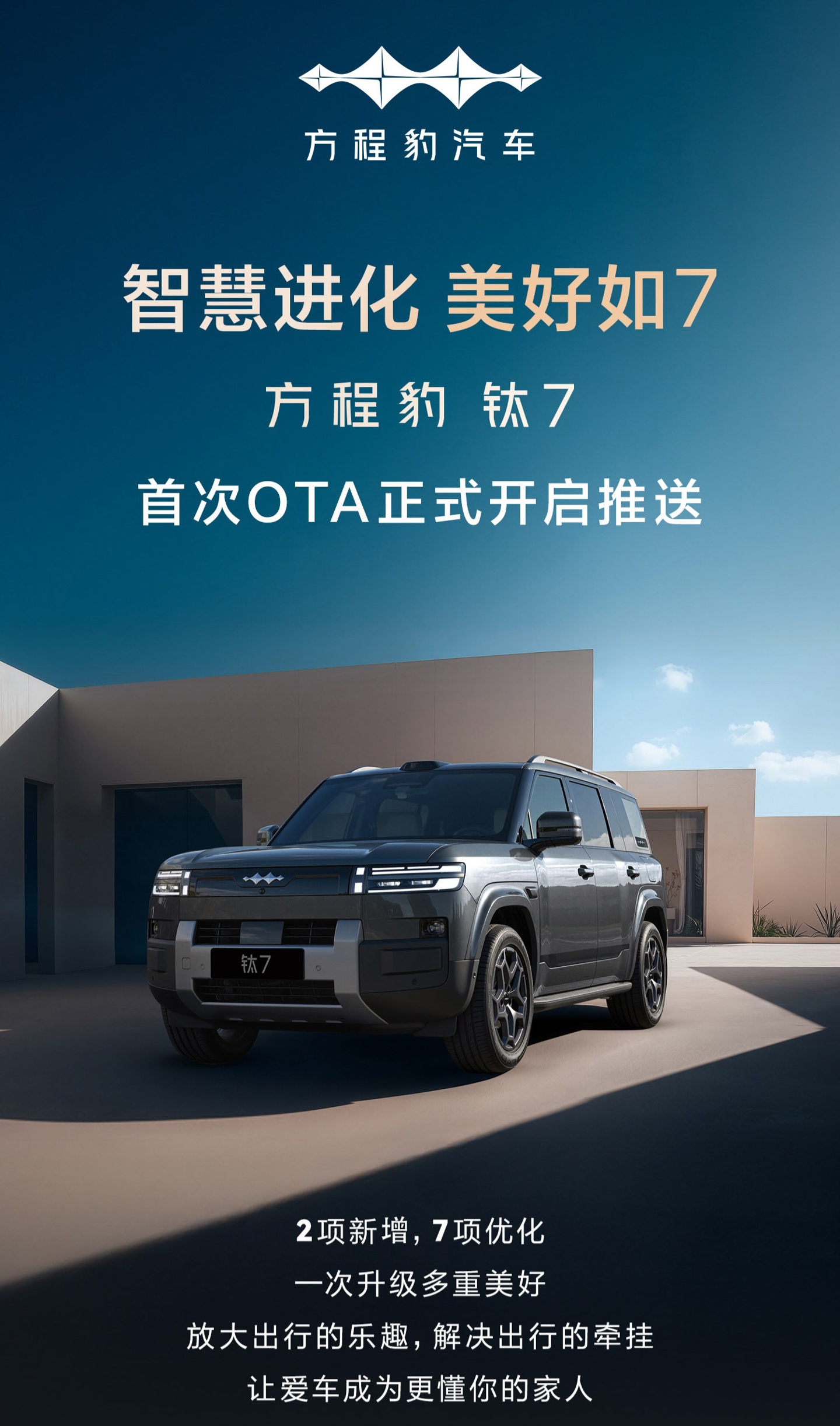IT之家 12 月 4 日消息,比亚迪方程豹汽车官方微博今日宣布,钛 7 汽车首次 OTA 正式开启推送,新增智慧物联场景模式等 2 项功能、提供调整直流充电策略等 7 项优化。