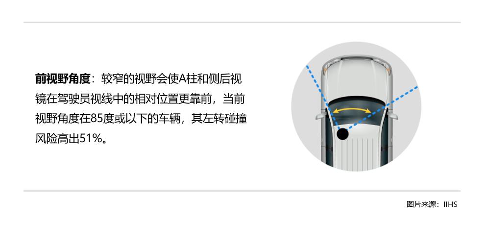 进一步分析发现,驾驶员侧盲区的“空间分布”同样关键:与前方视野角度大于90度的情况相比,视野角度在85度或以下的车辆,其左转碰撞风险高出51%。较窄的视野会使A柱和侧后视镜在驾驶员视线中的相对位置更靠前,从而遮挡车辆行进方向上的更多区域。