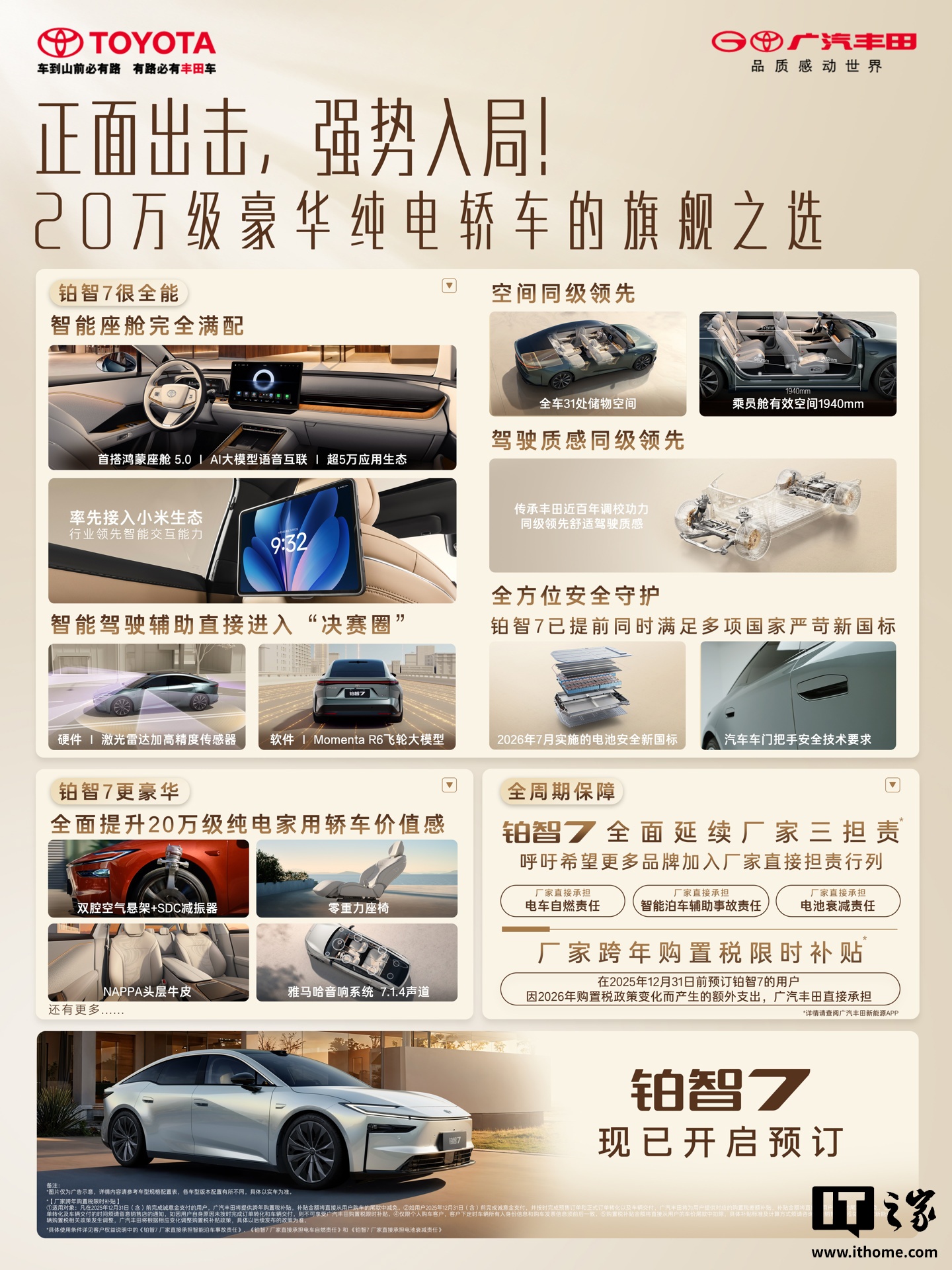 据IT之家此前报道,广汽丰田鸿蒙旗舰 D 级纯电轿车 —— 铂智 7 已开启预订。
