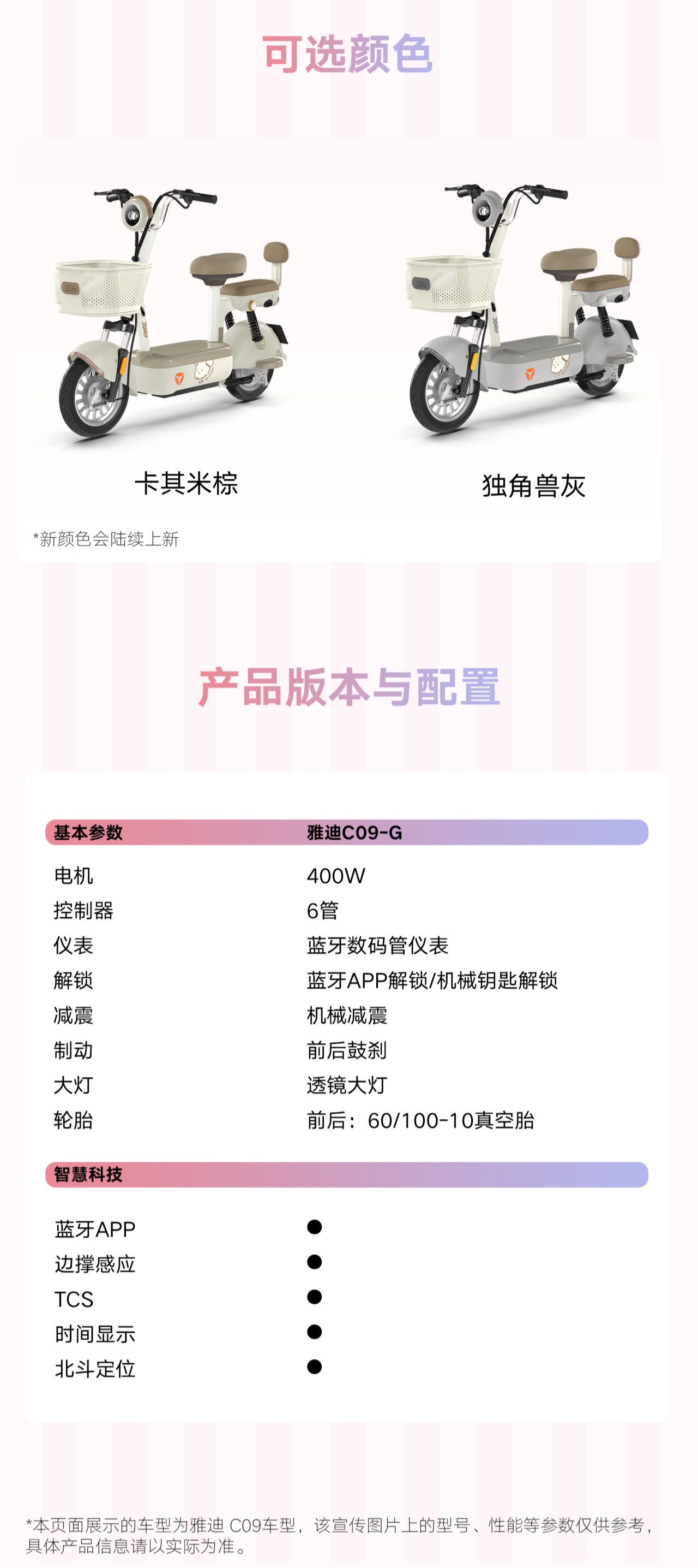 IT之家 12 月 6 日消息,雅迪电动车今日宣布,新新国标车型 C09 全新上市,京东旗舰店显示首发价 2399 元。新车提供了卡其米棕、独角兽灰两款配色,新颜色会陆续上新。