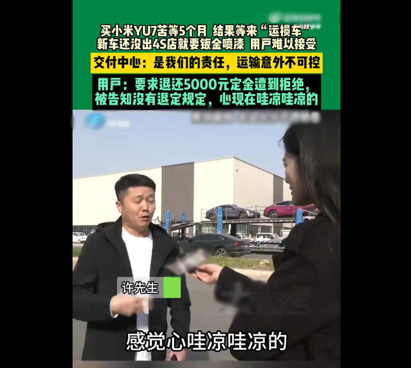 12月1日,郑州的许先生向媒体求助,称自己预订的小米YU7汽车在苦等五个月后,到手的竟是一辆运损车。车身出现明显凹坑,让许先生无法接受。面对镜头,许先生说,“新车还没开出4S店,让我钣金喷漆,我苦苦等了5个月的车,告诉我有个凹陷。”