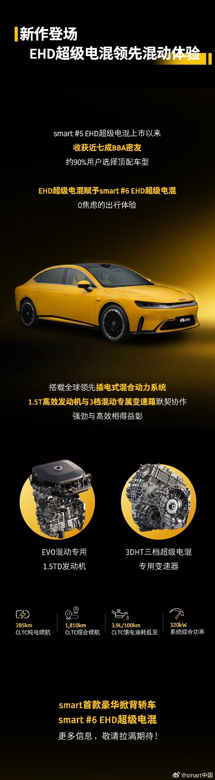 动力方面,该车搭载全球领先插电式混合动力系统,匹配 1.5T 高效发动机与 3 档混动专属变速箱。CLTC 纯电续航里程 285km,CLTC 综合续航 1810km,CLTC 馈电油耗低至 3.9L/100km,系统综合功率 320kW。