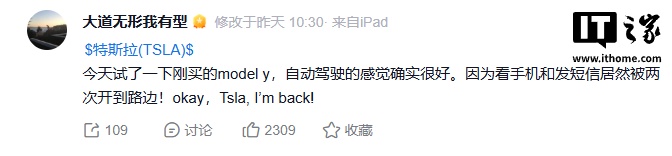 段永平表示,在试驾过程中自动驾驶的体验“确实很好”,但因自己在途中看手机和发短信,居然两次被车辆系统强制接管并开到路边停车。他还写道:“Okay, Tsla, I'm back!”,暗示其对特斯拉的重新认可。
