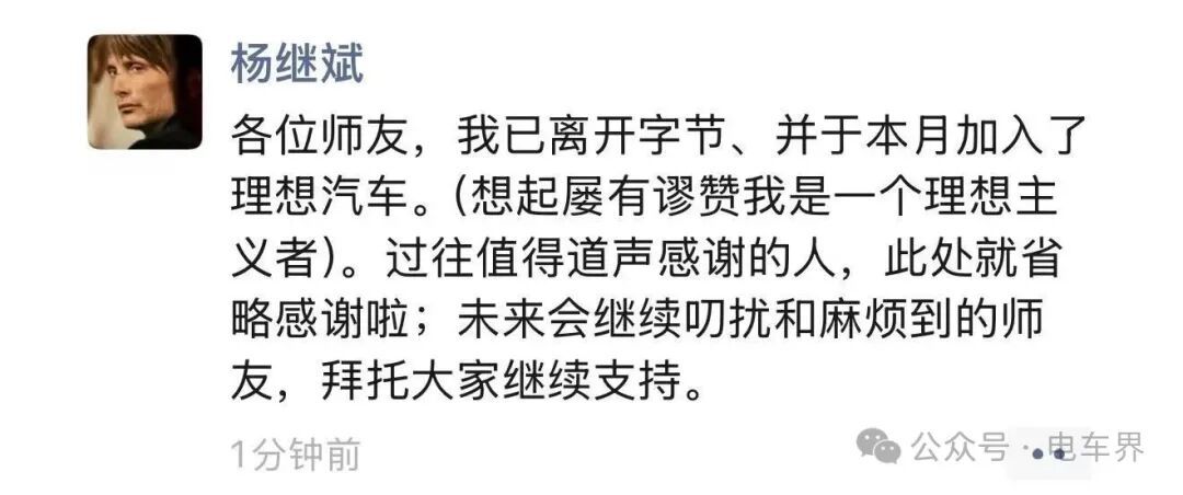 凤凰网科技讯 12月8日,据电车界消息,前字节公关总监杨继斌刚刚在朋友圈宣布,离开字节跳动,加入理想汽车。杨继斌表示,本月正式加入了理想汽车。虽未透露职位,但电车界猜测应该为公关一号位。
