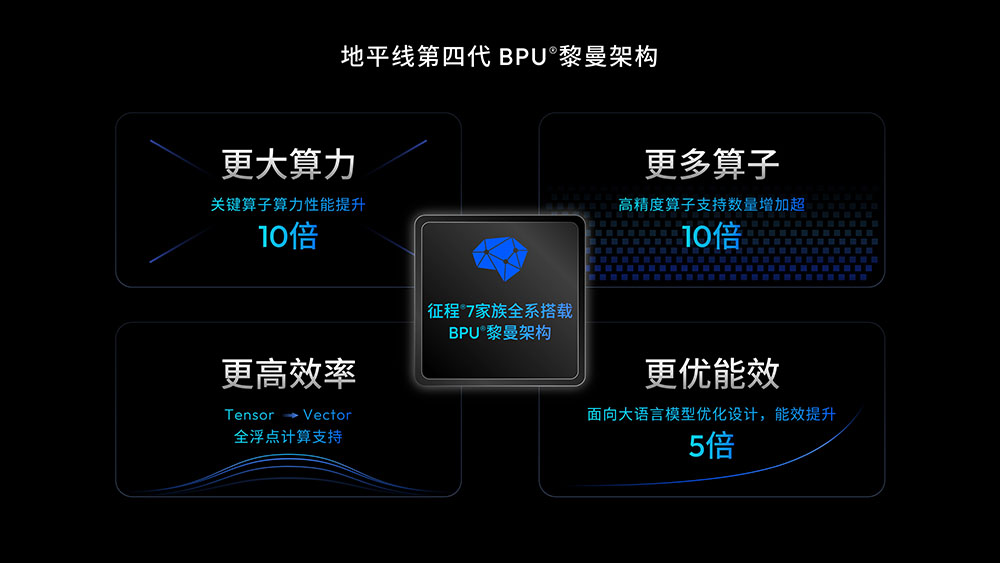 该架构具备四大核心优势——关键算子算力性能提升10倍、高精度算子支持数量增加超10倍、支持Tensor→Vector全浮点计算、面向大语言模型优化设计使能效提升5倍,将搭载于征程7系列芯片,逼近通用机器人计算终极架构。
