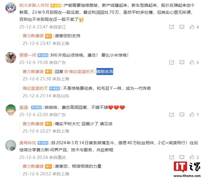 IT之家 12 月 9 日消息,赛力斯集团副总裁康波在 12 月 6 日发微博庆祝自己的粉丝数量突破 40 万,并在评论区解答了一些用户的疑问,有用户询问 MPV 车型要等多久,康波表示:“相信相信的力量。”暗示该车型已在规划中。