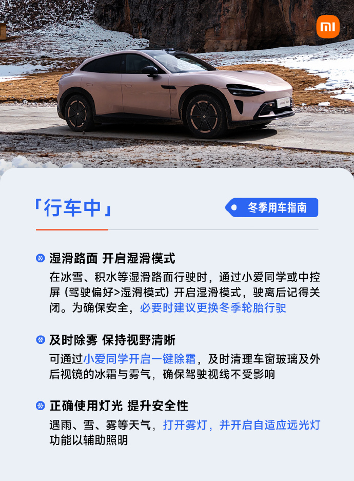 凤凰网科技讯 12月10日,小米汽车官方分享了一份冬季用车指南。其中提到,出行前检查胎压状态,胎压推荐值为2.9bar;避免低电量长停户外;洗车避免使用热水,以免车漆和玻璃因热胀冷缩而损伤;并建议不要直接用雨刮清理玻璃积雪,以免造成损坏。正确的操作方法是:先清扫表面积雪-通过中控屏开启“雨刮器维护模式-轻抬雨刮臂清除残留冰渣-最后使用前风挡除雾功能融化冰层。