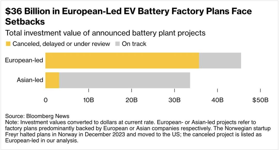 按照彭博社去年统计,计划在欧洲建设的16家工厂,已经有11家推迟或取消。其中奔驰合资电池公司ACC已经放弃新建工厂,大众PowerCo也收缩了全球扩张的计划。