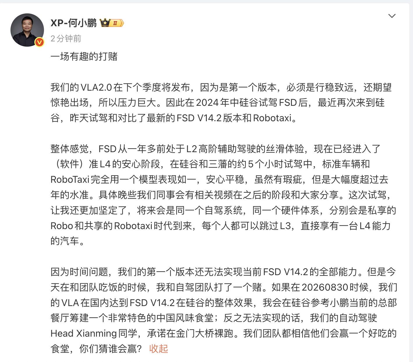 凤凰网科技讯 12月11日,小鹏汽车董事长何小鹏发文称,VLA2.0在下个季度将发布。并和团队打赌,如果在20260830时候,我们的VLA在国内达到FSD V14.2在硅谷的整体效果,会在硅谷参考小鹏当前的总部餐厅筹建一个非常特色的中国风味食堂。
