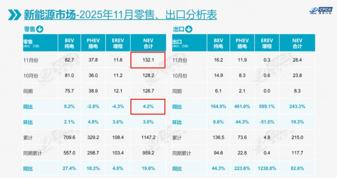 乘联分会最新数据显示,11月国内新能源乘用车市场零售量为132.1万辆,同比增长4.2%,新能源市场零售渗透率达到59.3%。