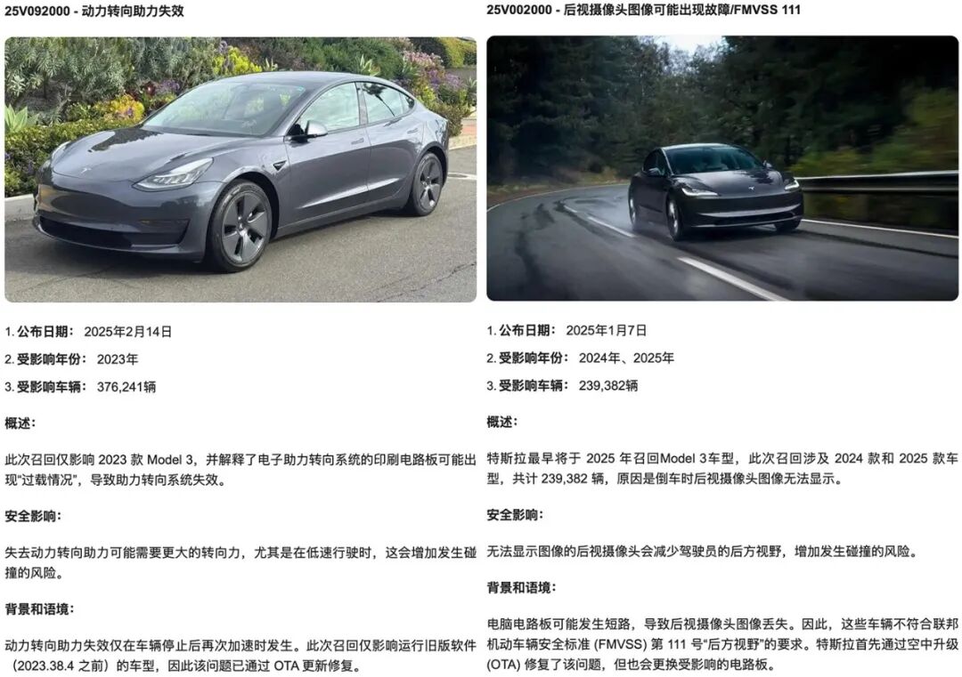 图/2025年特斯拉召回情况来源/互联网 新能源观截图