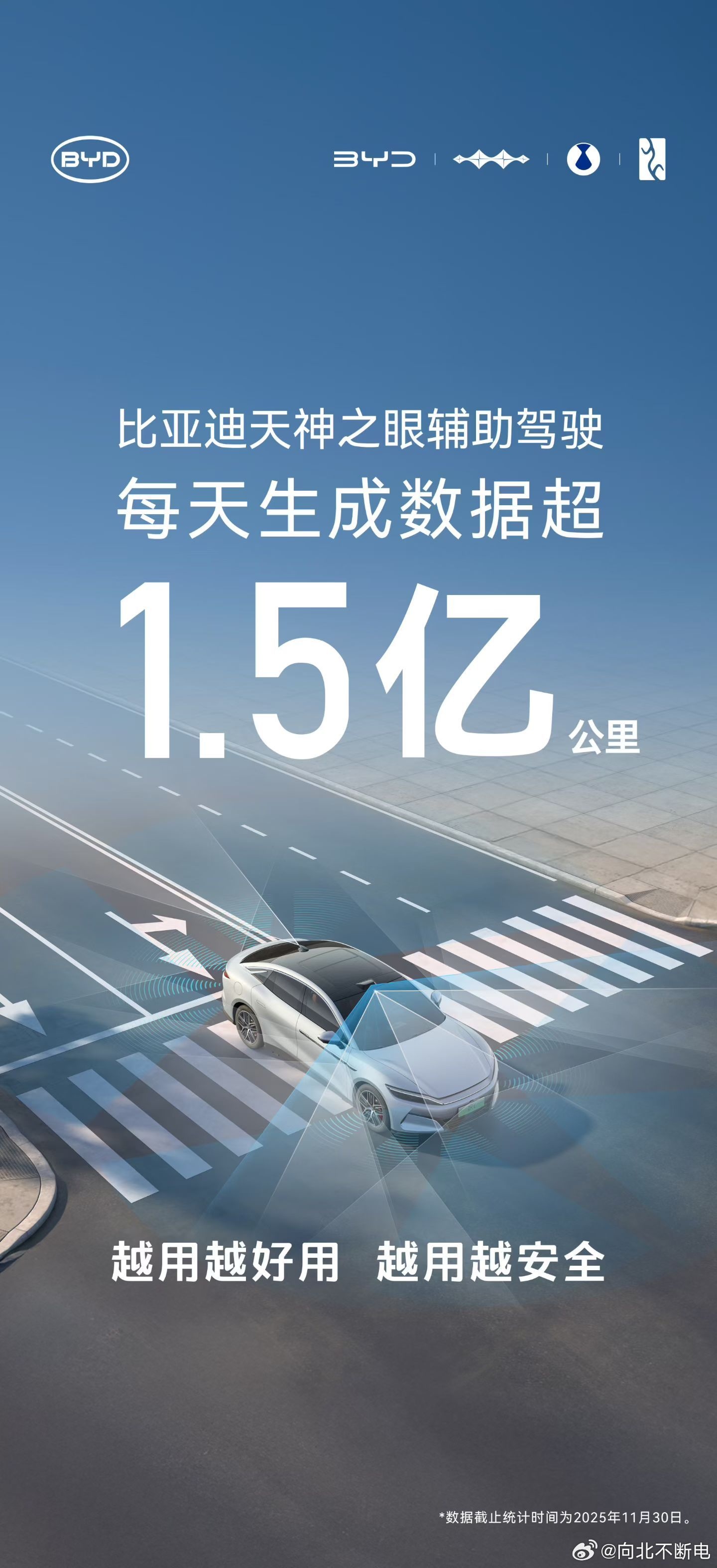 IT之家 12 月 15 日消息,据博主 @向北不断电 今日分享,比亚迪天神之眼辅助驾驶车型保有量超 230 万,每天生成数据超 1.5 亿公里(数据截止统计时间为 2025 年 11 月 30 日)。