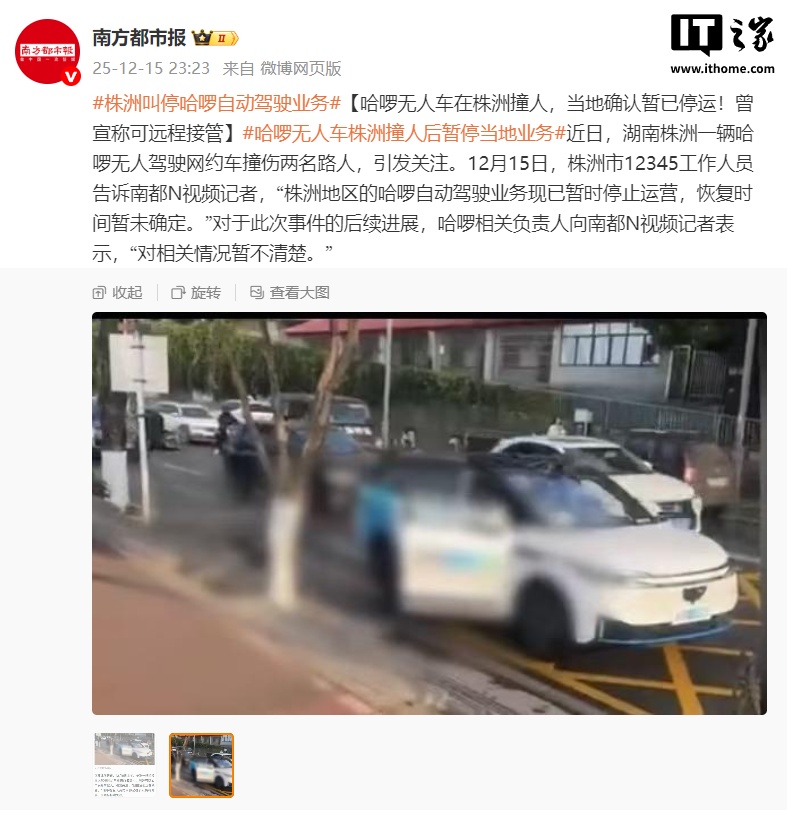 IT之家 12 月 15 日消息,本月 6 日,一段网传湖南株洲一辆哈啰无人驾驶网约车撞伤两名路人的视频引发关注。