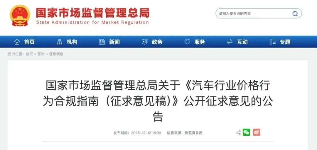 北京时间12月12日,国家市场监督管理总局发布《汽车行业价格行为合规指南(征求意见稿)》(以下简称“指南”),规范汽车行业价格行为。