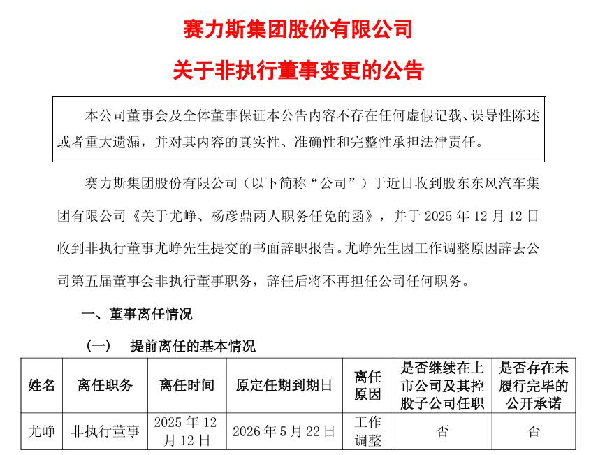 12月13日,赛力斯发布公告,非执行董事尤峥因为工作调整原因,辞去公司第五届董事会非执行董事的职务,辞任后不再担任赛力斯任何职务。