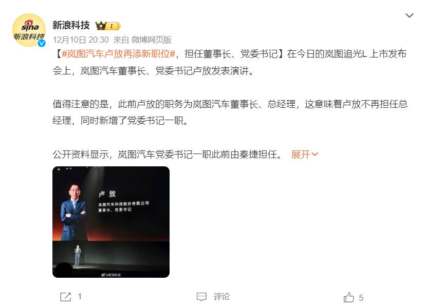稍早之前的12月8日,岚图汽车的管理层架构完成关键性调整。据媒体报道,卢放担任岚图汽车科技股份有限公司董事长、党委书记,推荐原岚图COO蒋焘担任岚图汽车科技股份有限公司总经理(CEO)。