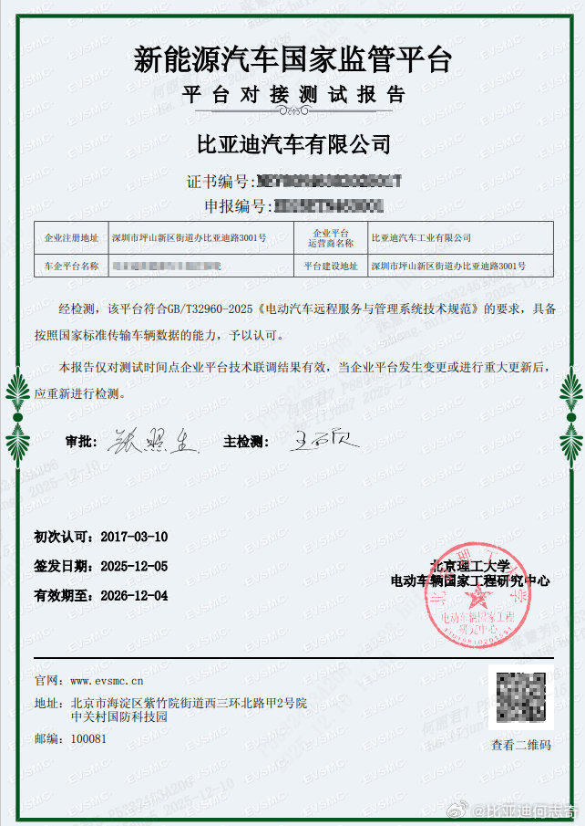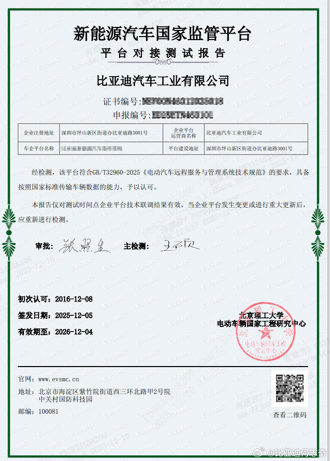 据了解,为加强新能源汽车推广应用全过程监管,防止“骗补”、保障车辆运行安全、提升产品质量,中国政府自2016年起逐步建立并完善了新能源汽车国家监测与管理平台。所有获得国家财政补贴的新能源汽车生产企业,必须将车辆运行数据实时上传至该平台。为此,工信部要求所有拟接入平台的新能源汽车产品,必须通过符合性认证,确保其车载终端、通信协议、数据格式、信息安全等方面满足《电动汽车远程服务与管理系统技术规范》等相关国家标准和平台技术要求。