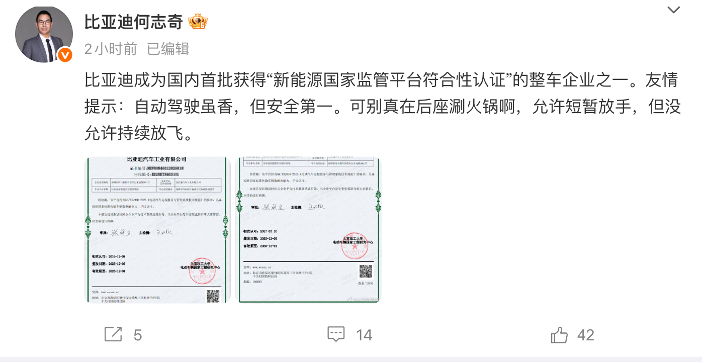 凤凰网科技讯 12月17日,比亚迪股份有限公司执行副总裁何志奇宣布,比亚迪成为国内首批获得“新能源国家监管平台符合性认证”的整车企业之一。他也提示:自动驾驶虽香,但安全第一。可别真在后座涮火锅啊,允许短暂放手,但没允许持续放飞。