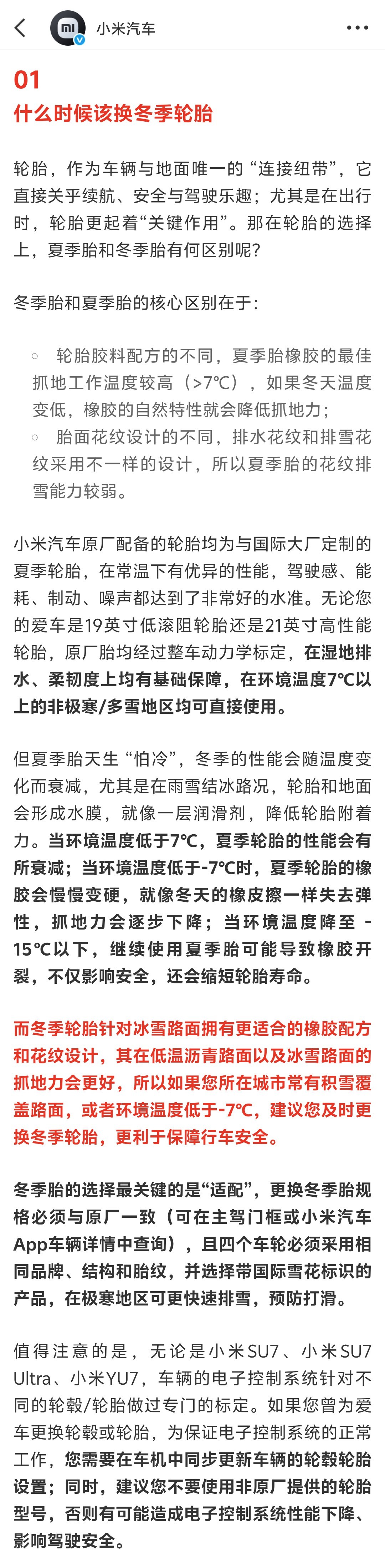 凤凰网科技讯 12月18日,小米汽车发布冬季轮胎安全科普文章。文中提到,当环境温度低于7℃,夏季轮胎的性能会有所衰减;当环境温度低于-7℃时,夏季轮胎的橡胶会慢慢变硬,就像冬天的橡皮擦一样失去弹性,抓地力会逐步下降;当环境温度降至-15℃以下,继续使用夏季胎可能导致橡胶开裂,不仅影响安全,还会缩短轮胎寿命。如果您所在城市常有积雪覆盖路面,或者环境温度低于-7℃,建议您及时更换冬季轮胎,更利于保障行车安全。