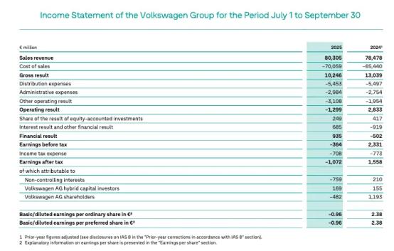 三季度财报显示,大众汽车集团该季度其营收为803.05亿欧元,同比增长2.3%;营业亏损12.99亿欧元,上年同期营业利润为28.33亿欧元,同比由盈转亏,差距超过41亿欧元。