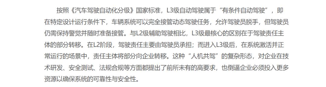 并且“出事儿了算谁的”这个责任主体变了。L2出事故,驾驶员全责。但L3不一样,在高速、快速路这些规定路段开车,只要是系统自己在开、没叫你接手时出了事,主要责任就归车企。