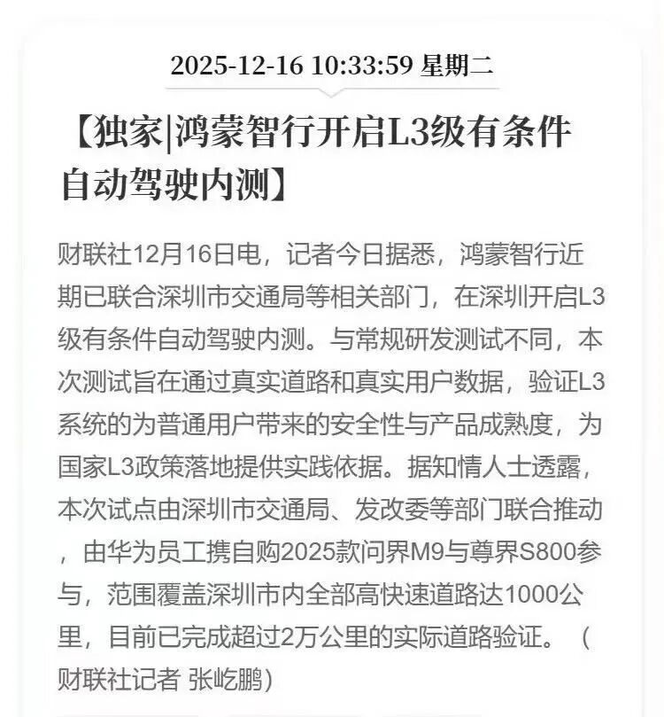 以及鸿蒙智行也同天宣布了在深圳全市搞L3内测,覆盖1000公里高快速路。而问界M9、尊界S800等车型靠着华为全套技术,成了测试主力。