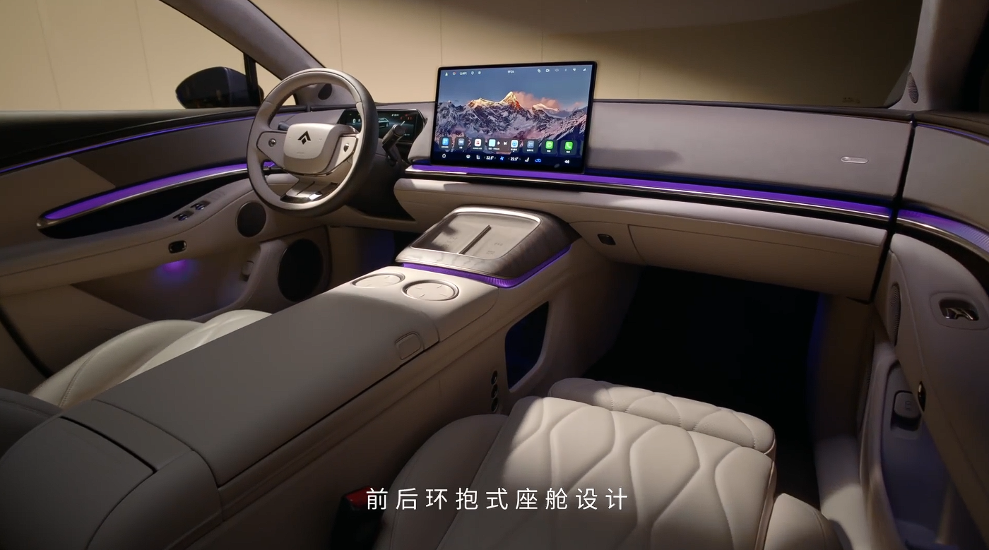 根据此前预热,昊铂 A800 拥有全球最长 6536mm 双环抱氛围灯,搭载鸿蒙座舱 HarmonySpace,采用前后环抱式座舱设计 + 无主灯式布局。新车后排扶手处提供触控屏,预计将支持车控等功能。