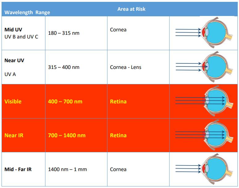 先说不伤眼这回事,其实波长在 400-1400nm 这个区间里,都属于视网膜危险区,激光是可以一路直达视网膜的,也就是说,功率但凡大一点,就把脖子哥的钛合金狗眼给烧穿了。
