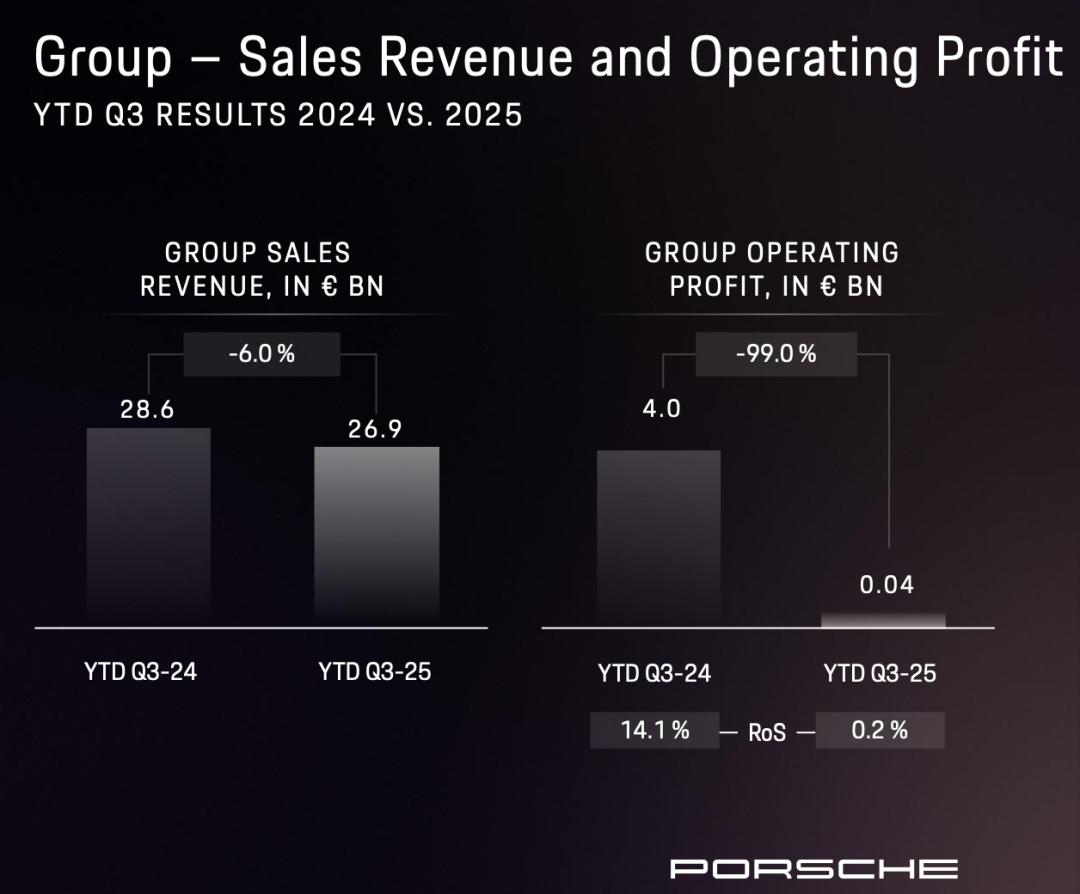 其失速更是直接拖累了保时捷的财务表现。仅2024年前三季度,保时捷因重组产生的特殊支出就高达27亿欧元。第三季度单季亏损9.66亿欧元,直接导致前三季度销售利润仅为4000万欧元,与去年同期的40.35亿欧元相比暴跌99%。这一“断崖式”下滑,让保时捷不得不重新审视其电动化战略的节奏与路径。