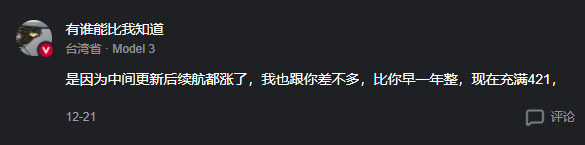 还有 2023 年款的 Model 3 车主表示,是因为中间更新后续航都涨了,我也跟你差不多,比你早一年整,现在充满 421 公里。