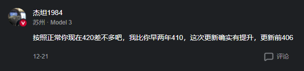 2022 年款的 Model 3 车主则分享自己的 410,但这次更新确实有提升,更新前 406。