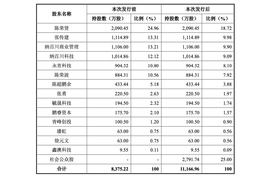 招股书显示,纳百川实控人陈荣贤一家三口通过直接+间接持股,合计控制55.58%股份。这一家三口更是在公司内部形成了“决策权+运营权+信息披露权”的家族主导格局:陈荣贤本人担任董事长、其妻子张丽琴担任总经理助理、儿子陈超鹏则担任董秘。
