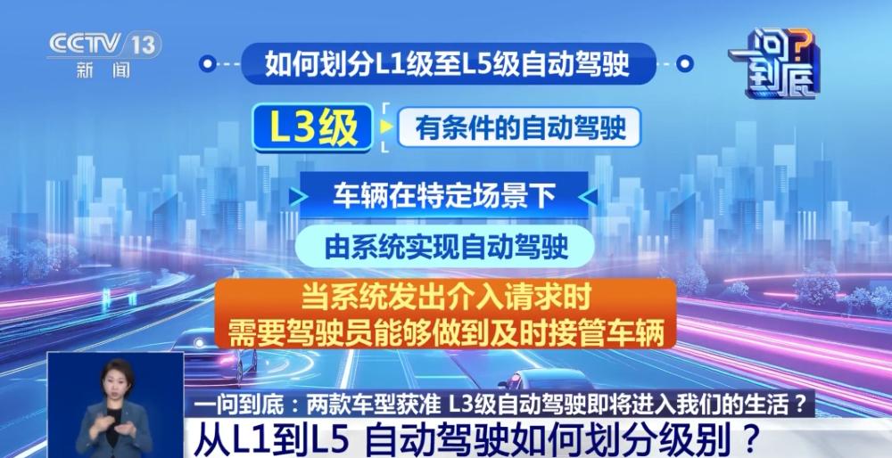 央视在新闻节目中给出了如何划分L1级至L5级自动驾驶,其中对于L3级自动驾驶的定义为有条件的自动驾驶,车辆在特定场景下由系统实现自动驾驶,当系统发出接入请求时,需要驾驶员能够做到及时接管车辆。