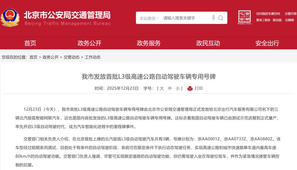车东西12月23日消息,就在今天,北京市首批L3级高速公路自动驾驶车辆专用号牌由北京市公安局交通管理局正式发放给北京出行汽车服务有限公司名下的三辆北汽极狐智能网联汽车。