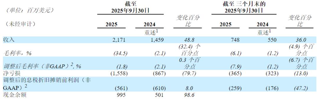 但其综合毛利率却降到了-34.5%,明显低于去年同期的-2.1%;前三季度净亏损15.58亿美元(109.5亿元),较去年同期亏损扩大了79.7%。