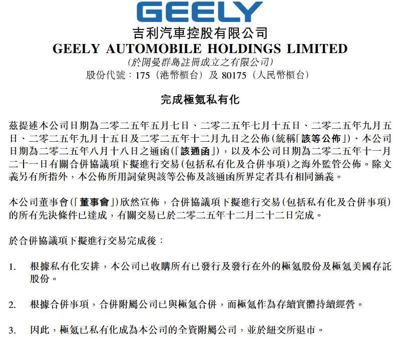 昨天半夜,吉利发公告宣布,已经正式完成极氪私有化合并事项。