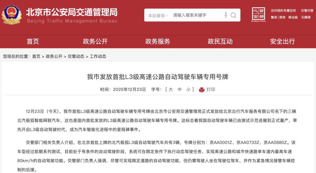 12月23日,北京首批L3级高速公路自动驾驶车辆专用号牌由北京市公安局交通管理局正式发放给北京出行汽车服务有限公司名下的三辆北汽极狐智能网联汽车,这也是国内首批发放的L3级高速公路自动驾驶车辆专用号牌。