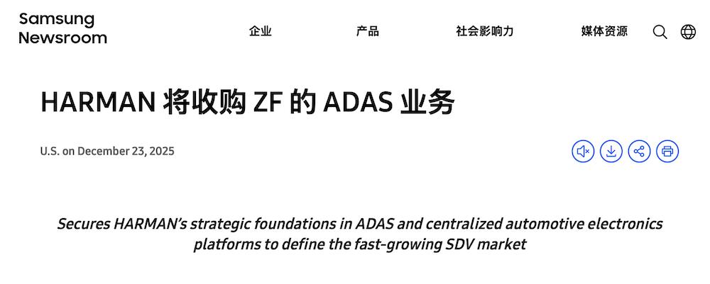 车东西12月24日消息,三星在当地时间周二官宣,其子公司哈曼国际(Harman)将以17.6亿美元(约合人民币123亿元)的价格收购全球知名汽车零部件供应商采埃孚(ZF)的高级辅助驾驶系统(ADAS)部门。