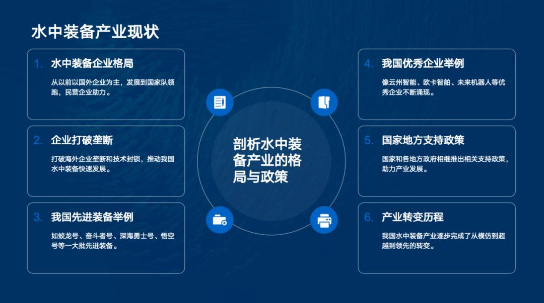 具体到我国水中装备的发展过程和现状,早年间,中国海洋装备领域的核心技术和高端产品长期被康斯伯格、ABB等欧美企业垄断,国产船舶和海洋装备的发展较缓慢,普遍存在产品体积和重量较大、功能相对单一、效率低下,而且污染严重等问题。随着科技的进步,中国的水中装备产业已经完成了从追跑到领跑的转变,在0至1万1千米间每个层级的海洋深度下,都有中国国产装备的身影。市场也涌现出了一大批相关企业,比如国家队的中船、中航天、中石油,中海油等,民营主机/船厂欧卡智舶、云州智能、未来机器人、纳百、博雅工道等,同时也涌现出了大批打破了国际垄断的先进海洋装备,比如水下的蛟龙号、奋斗者号、悟空号等。