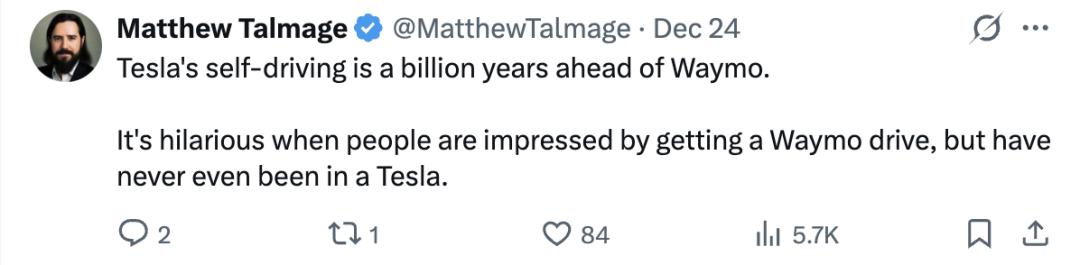 所以,现实依然是,Waymo在规模、合规和商业化进度上处于绝对领先;特斯拉押注的是FSD成熟后带来的指数级扩张能力。