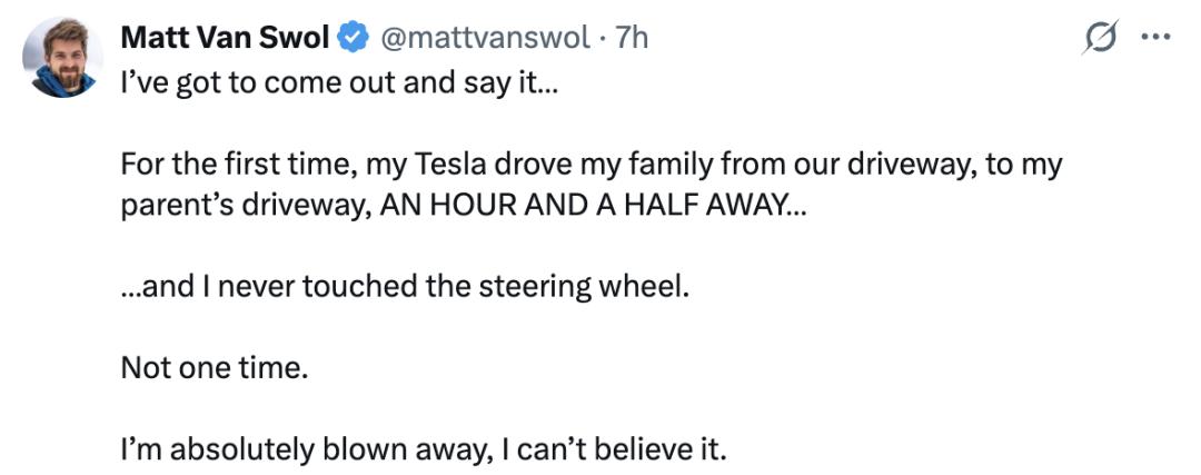 我憋不住了:我的特斯拉第一次载着我们全家,从自家车道一路开到父母家,整整一个半小时车程……我一次都没碰方向盘。