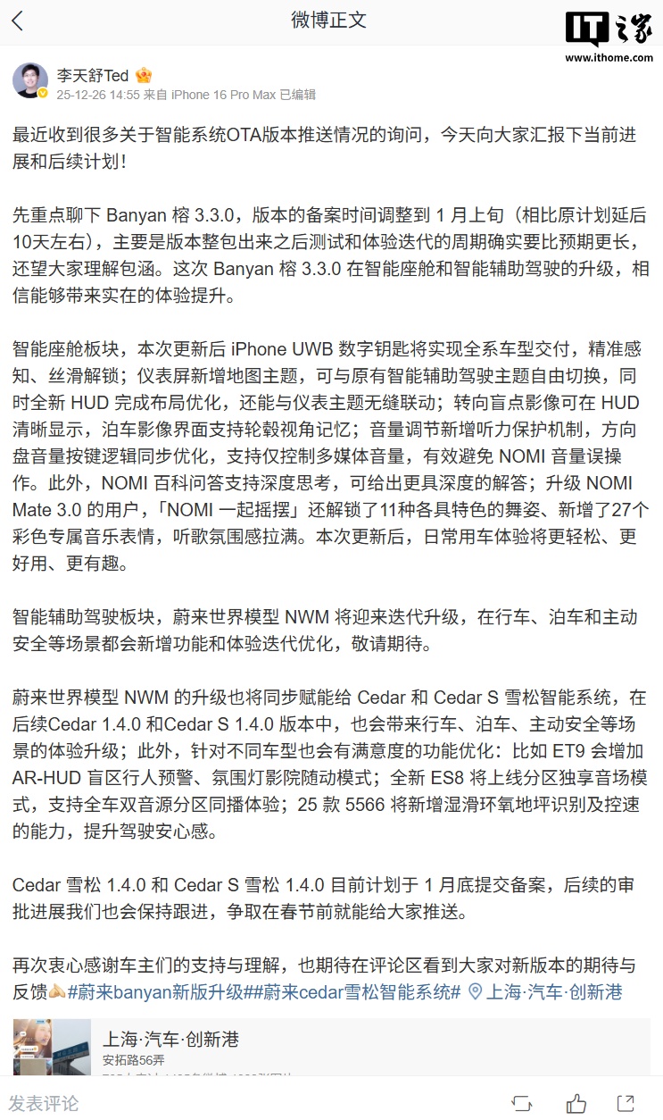 IT之家 12 月 26 日消息,蔚来汽车产品副总裁 @李天舒Ted 今日在微博发文,公布了有关系统 OTA 版本推送情况及最新进展。