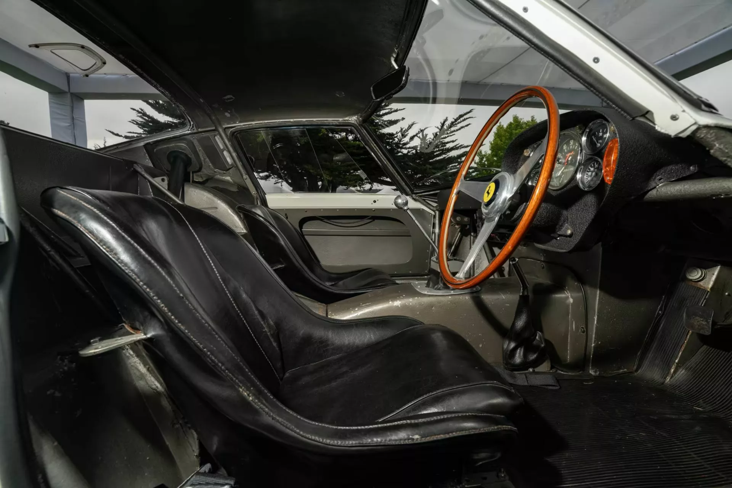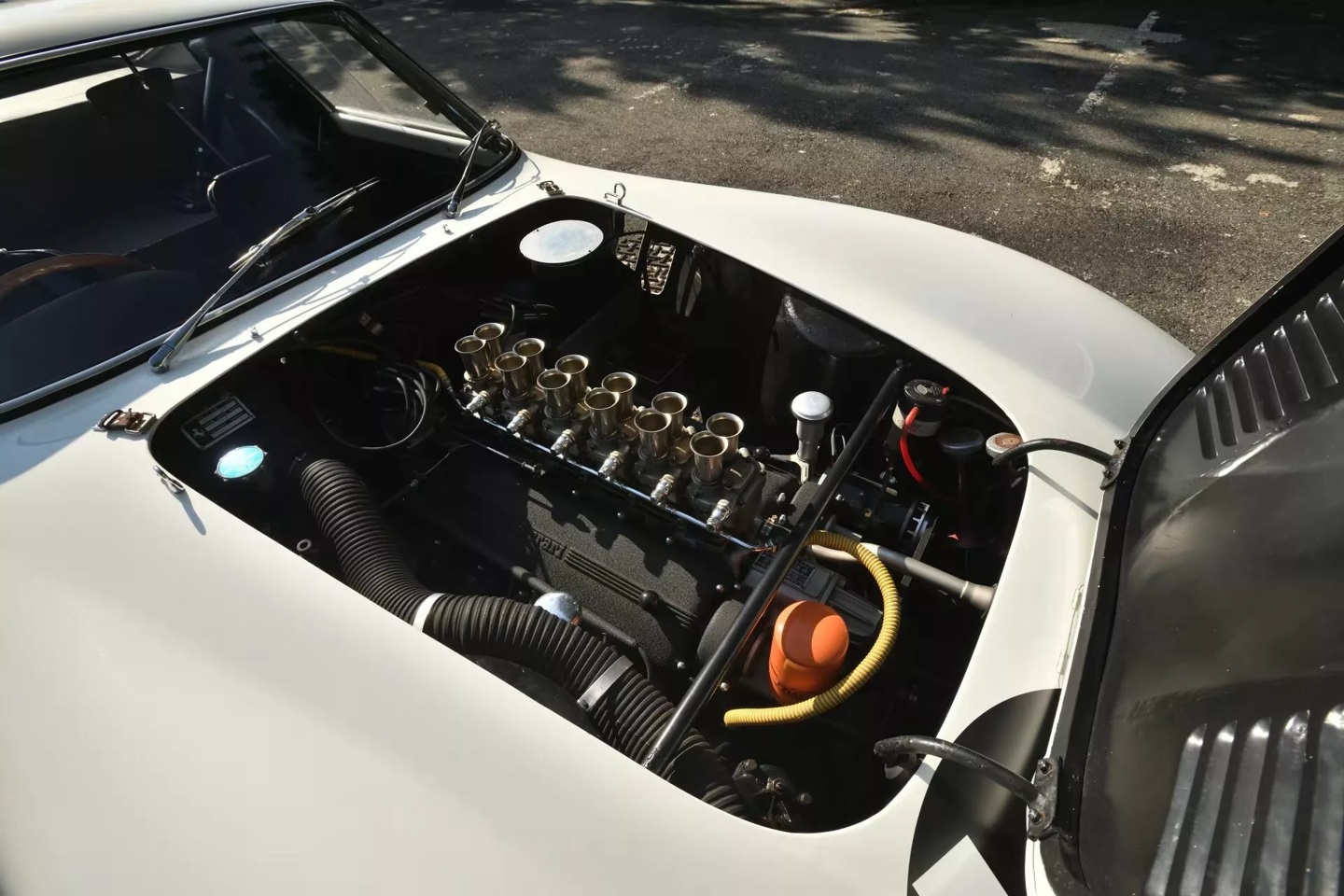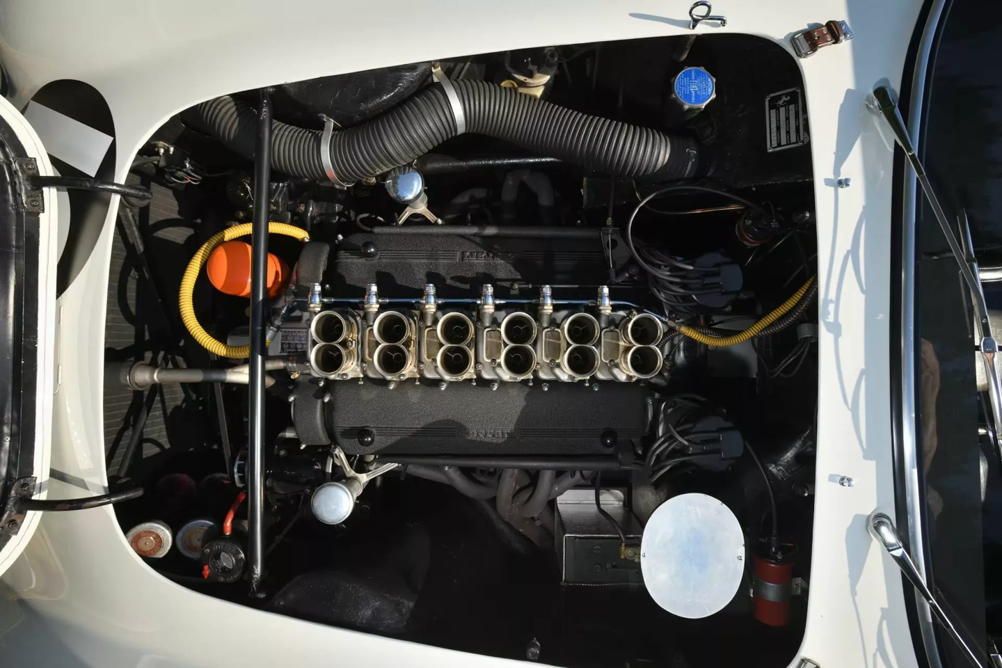 值得一提的是,此次拍卖不仅包含车辆本身,还附带一套极其珍贵的原厂赛车备件库,其中包括一台完整的备用 V12 引擎、额外的轮毂、制动系统以及双 Marelli 分电器等。车辆保留了原始的五速手动变速箱和六个 Weber 化油器,机械状态堪称完美。